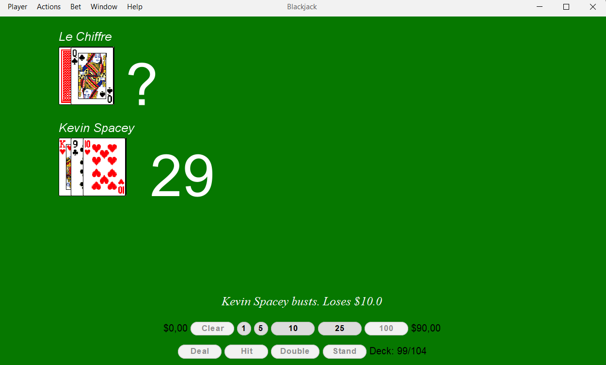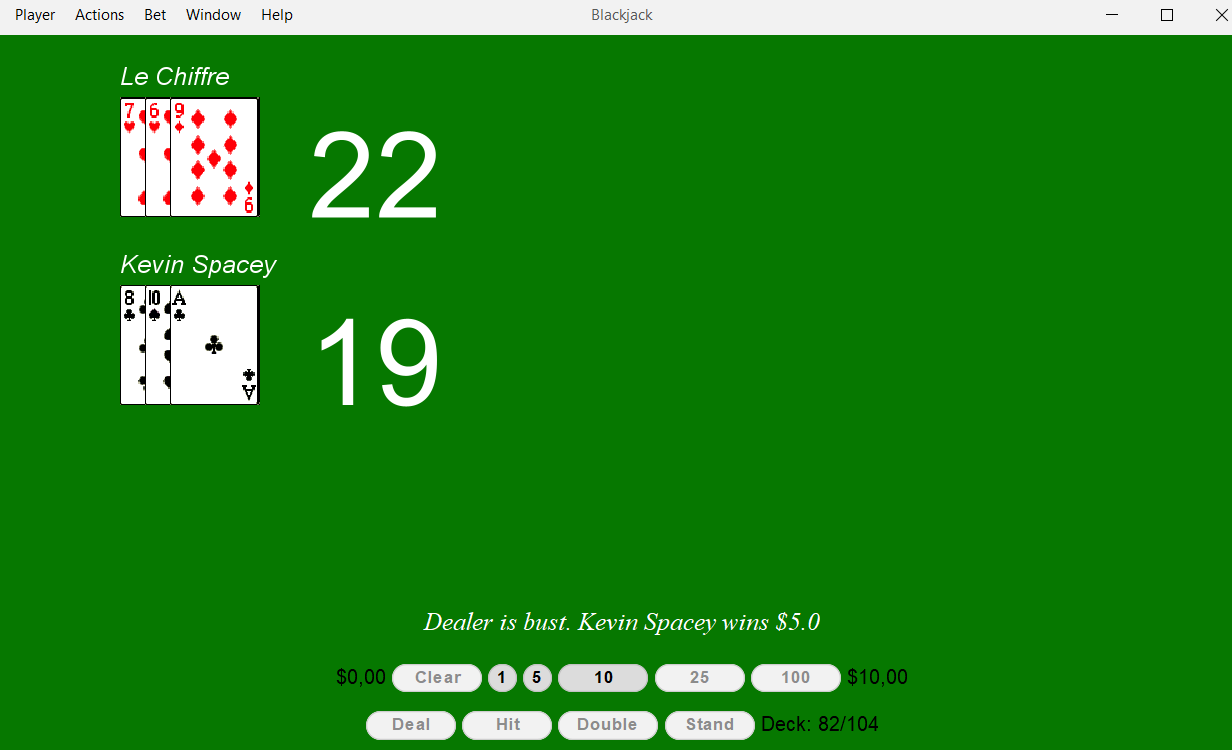 First approach player only know the guidelines of the game and tries to stand below a fixed score and bet always the minium wage. The smart player is defined more or less by the routine of the game and doesn’t care about the cards appeared.
