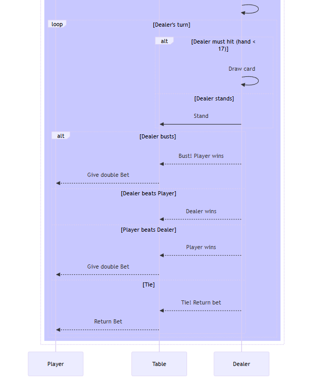 The project follows the basic guidelines of the MAS architecture. The more complex case of study in which an agent player relies on strategist agents has been moved to a specifc package inside the asl directory. Noteworthy is the implementation of the TwentyOneEnvironment that is used for all the case studies, to support and divide the responsability a GameEnvironmentUtils has been made to mantain a cleaner code to handle the action and beliefs of the agents. Attention has been given to some functionalities that are needed only in certain scenarios. For example the strategist agents only have to know the cards of the player only at the end of the game to update their card count when in the other circumstances player updates his internal counter in real time when sees dealer cards or hits.